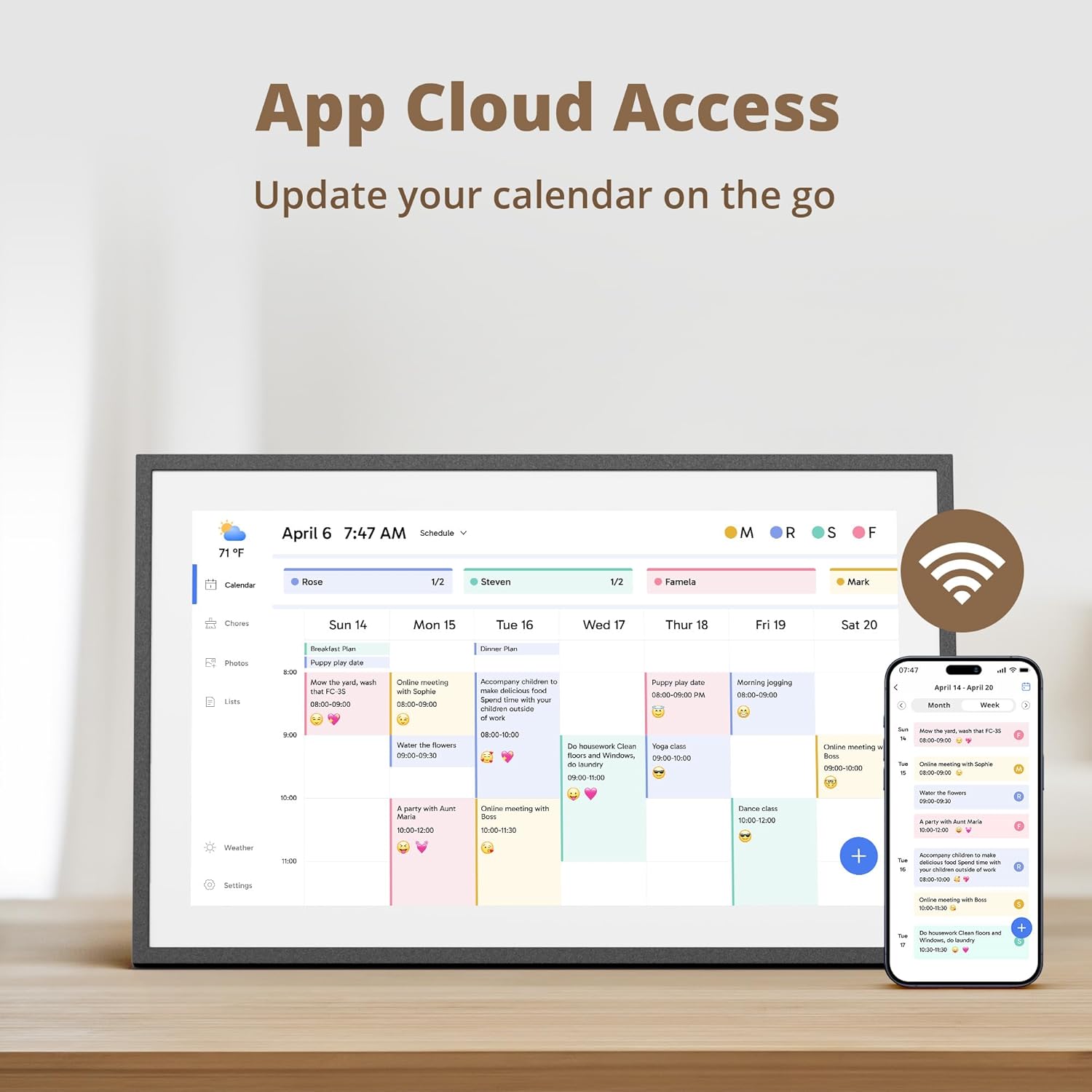 【Easy Setup and Auto-Sync】: Enjoy a user-friendly design that our smart picture frame allows for quick setup—just plug in, connect to Wi-Fi, and link your calendar to the Mobile App. Once synced, it seamlessly integrates multiple personal calendars (iOS, Google, etc.) into one unified interface. Authorize additional devices for even greater convenience.