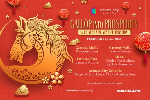 MANY Chinese New Year celebrations are set to take place in Araneta City malls on Feb. 17, with the theme “Gallop in Prosperity.” One is the Prosperity Event at the Quantum Skyview, Gateway Mall 2, featuring a cultural show of acrobats and dragon dancers at 2:30 p.m. to attract luck. Photobooths are available so shoppers can capture memorable experiences. Over at the Farmers Plaza Activity Area, a mini-Chinatown will be put up, with striking lanterns, oriental lamps, a horoscope exhibit, and tarot card readers. Finally, there will be dragon and lion dances in Gateway Mall 1 and 2, Quantum Skyview in Gateway Mall 2, Farmers Plaza, and Farmers Market and Farmers Garden. These traditional Chinese performances are believed to bring good luck, prosperity, and joy while driving away evil spirits and negative energy.