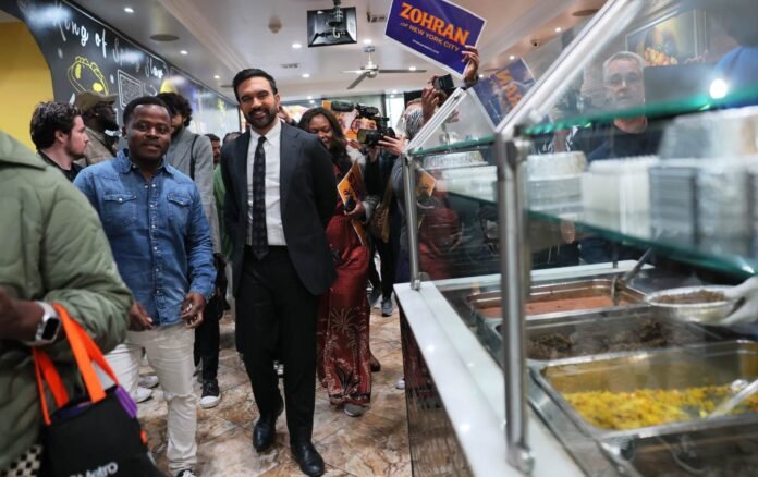 Kreyol Flavor owner Cursy Saint Surin walks with Democratic Mayoral Candidate Zohran Mamdani inside of Kreyol Flavor as he takes a tour of the neighborhood on October 25, 2025 in the East Flatbush neighborhood of the Brooklyn borough in New York City. Mamdani was joined by Assembly member Rodneyse Bichotte Hermelyn and City Councilmember Farah Louis.