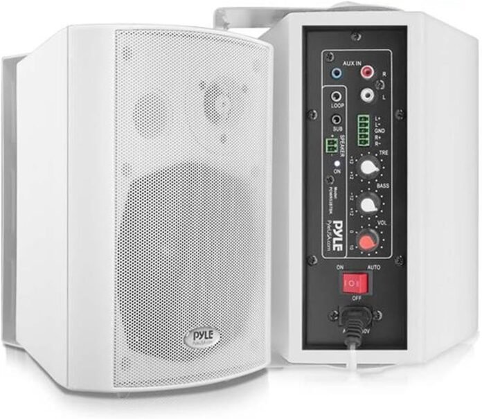 Features: – versatile wall mount speaker system – includes (2) Speakers (Active + Passive) – Universal indoor home speaker installation – Bluetooth Wireless Music Streaming – Built-in Digital Sound Amplifier – 2-Way Full Range Stereo Sound Reproduction – impressive bass Response – rear panel Audio settings control center – Connect & Stream Audio from external devices – RCA (L/R) audio connector jacks – aux (3.5mm) input jack (loop + sub) – screw terminal block speaker connectors (active speaker) – rotary volume, bass, treble adjustment – power LED indicator light – adjustable Angle Wall Mount brackets – Rugged & Heavy Duty Cabinet Enclosure – unique standby/ auto power on with audio signal input – removable & rust Proof metal speaker Grills – Daisy-Chain Ability (Active to Passive Speaker) stereo system – Used for home, garage, enclosed patio & porch deck applications – recommended for indoor use only Bluetooth connectivity: – Built-in Bluetooth for wireless Music Streaming – Simple & Hassle-Free Pairing – Works with all of today’s latest devices – (Smartphones, Tablets, Laptops, Computers, etc.) – Bluetooth Version: 4.2 – Bluetooth Network Name: ‘PyleUSA’ – Wireless Range: 33’+ ft. What’s in the box: – active wall mount speaker – Passive wall mount speaker – power cable Technical Specs: – power Output: 300 Watt max – Speaker Size: sound system: 5.25’’ subwoofers: 0.5’’ Tweeters – Subwoofer Type: polymer PP – Tweeter Type: Mylar dome – Frequency Response: 70 – 16 kHz (+/-3dB) – Speaker impedance: 8 Ohm – Audio Sensitivity: 86 db – construction material: metal alloy, reinforced polypropylene – power cable length: 3.9’ ft. – power Supply: 120-240v – Single Speaker Dimensions (L x w x H): 7.2” X 6.5” X 9.6” -Inches (Each