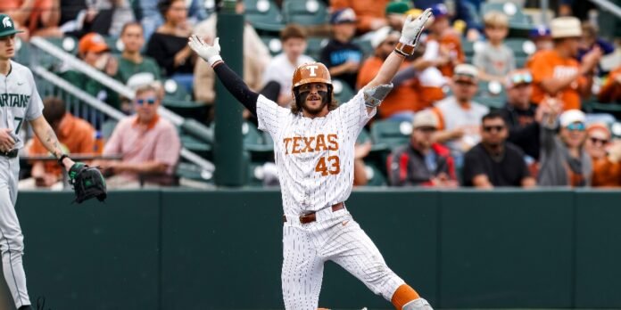 Aiden Robbins (43) Texas Longhorns vs Michigan State Spartans in a D1 NCAA baseball game at Disch-Falk Field in Austin, Texas on Saturday, February 21, 2026 (Photo by Eddie Kelly/ProLook Photos)