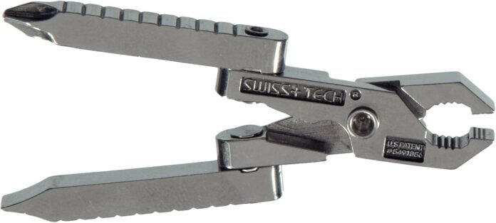 The Swiss+Tech ST50022 6-in-1 Multitool Key Ring features a flathead screwdriver, a Phillips head screwdriver, pliers, a wire cutter, a wire stripper, and a sheet shear. The small pocket tool kit is ideal for use while camping or hunting, for auto repair, for installing hardware, and much more. The screwdrivers feature 1/8 inch rule markings, and the screwdriver tips meet ANSI standards. Made of solid stainless-steel construction, the pliers multitool comes with a polished finish.