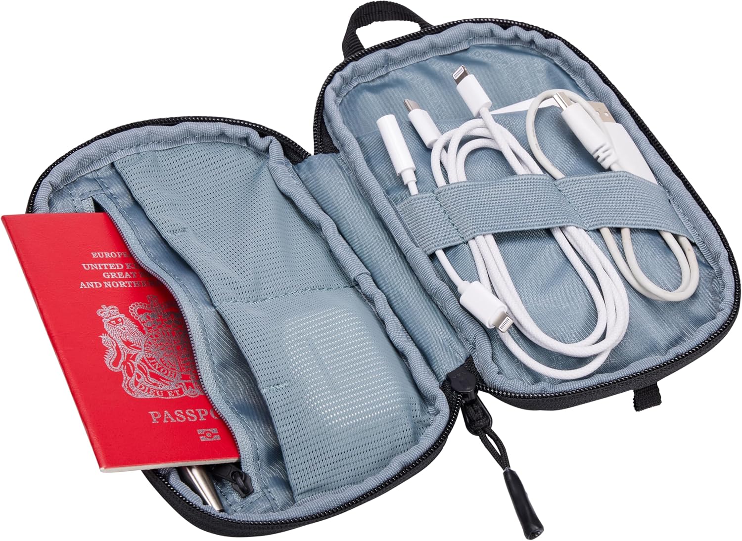 Organize a portable charger, cords, and accessories in a variety of secure pockets and elastic loops