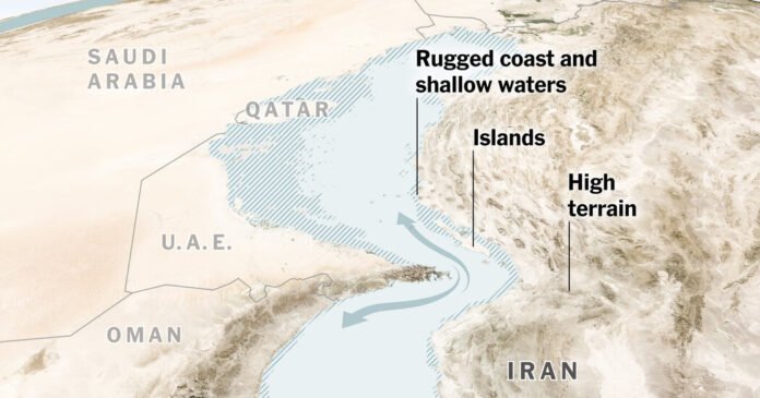 The strait is narrow and shallow, forcing ships within miles of Iran’s mountainous shores, a landscape that favors asymmetric warfare tactics, in which Iran uses weapons that are small, widely dispersed and hard for adversaries to eliminate completely.